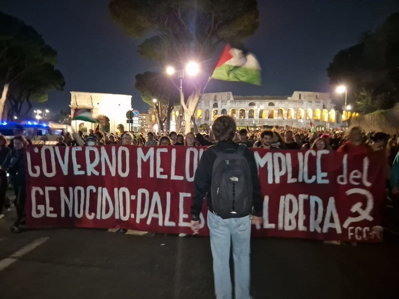 FC e FGC organizaram um grande bloco comunista sob o lema “VAMOS EXPULSAR O GOVERNO CÚMPLICE DO GENOCÍDIO”, que atingiu um tamanho expressivo, demonstrando a força e a vitalidade dos comunistas aos olhos de milhares de pessoas, energizando a marcha com palavras de ordem combativas contra o governo, contra o imperialismo e contra os planos EUA-EU-OTAN ativamente apoiados pelos capitalistas italianos, e em apoio à luta pela libertação da Palestina.